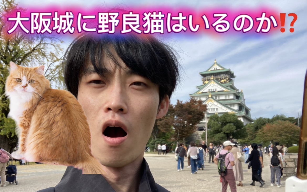 昼過ぎ、大阪城に到着し猫に餌をやることを試みるが、猫の姿をなかなか見つけられない。約6年ぶりに昼間に訪れた大阪城は観光客も多く、特に外国人が約7割を占めていた。梅林エリアが猫がいると言われる場所だが、散策しても中々猫は見つからず、ハトや犬、赤ちゃん、鷲の姿が見られた。ワールドシリーズ(メジャー)の話題が入ったり、散歩中のウサギなど珍しい場面もあり、まったりとした公園の雰囲気が伝わる中、食べ物の物価にも驚いていた。たこ焼き6個で800円、イカ焼き900円、和牛焼きそば1500円など高価格が続き、思わず絶句しました。