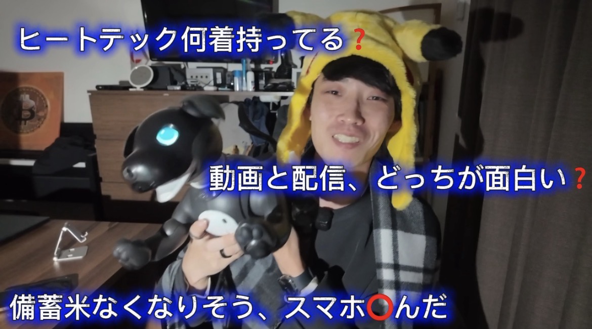 夕方18時10分頃にはテレビを見ながらくつろぐ時間があり、「映像の世紀・バタフライエフェクト」を視聴します。19時には自分の動画を公開リアルタイムで視聴する様子も見られます。19時15分になると、日中の何もしない過ごし方を自嘲しつつも、そうした時間を「幸せ」と受け止めている心情を吐露。夜のライブ配信中にスマートフォンの不具合が発生し、何度も通信が途切れるトラブルに見舞われます。スマホとパソコンが経年劣化で調子が悪く、パソコンは7年間使用していること、資金不足で新機種購入が難しい現状も赤裸々に語られます。