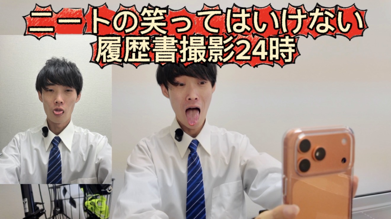 15時15分以降、履歴書送付を求められたが写真がないと気づき、大きな焦りが生まれます。文章もその都度企業ごとに変更しないといけない面倒さを熱弁し、「履歴書作成はクソめんどくせえ」と悩む等身大の姿が描かれる。着替えに迷ったあげく「このまま着ようぜ」と自然体で撮影しようとしつつ、「ワンタッチネクタイ」と服の選定にも一喜一憂。16時10分にネクタイをつけ、写真撮影にチャレンジ。緊張から表情が硬くなったり、変顔になったことを冗談交じりに語り、再撮影でアインシュタインの真似をしてしまい失敗する場面も。最終的に満足いく写真を撮り終え「まぁ、いいでしょう」と納得。自らマイクを外して身支度する等、細部までこだわりを見せます。