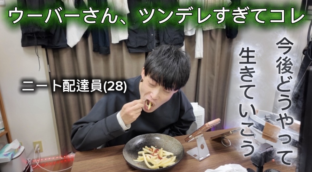 午後14時15分には、新たな動画制作に取り組み始める。「誰にも見られない悲しい動画」と自嘲しつつもクリエイティブな日常を積み重ねる。夕方17時30分には買い物を終え、購入したチョコモナカやどら焼きを紹介、リラックスした食事風景を展開。夜にUber配達に出るつもりでいたが、この日はUberアプリ内の「クエスト」が消失しており、午前には存在していたクエストが午後には提供されず、その要因を「昨日稼ぎすぎたのかな❓」「昼間稼働しなかったからか❓」と推測。クエスト制度が配達員ごとに異なり、SNS上でも金額に差がみられること、また近年は金額が大幅に上がる事例もあるものの、今日は条件が悪いから配達を見送ることや、報酬構造の不安定さに悩む心境を素直に表現している。「明日、11回配達すれば追加報酬が出る」とタスク管理を整理し、「今日は無理せず休む」と意思決定のプロセスを明かす。