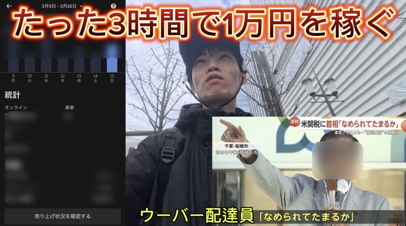 10時30分からUber配達を開始し、配達の仕組み「解体(複数注文を1つキャンセルする)」を実践。20分で976円を稼ぐなど効率良く配達をこなしますが、その過程で地理的ミスや「遠すぎる注文を受け取ったりする」など失敗も発生。600円台の配達や、外国人顧客のホテル配達を通してトラブルシューティング力が問われる場面も。効率化を図りつつも「鳴らずに遠くへ行って帰る時間がロス」に苦しむ状況や、「普通に雇われ仕事に戻るべきか…」と労働観を語る姿も印象的です。