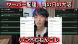 動画は朝9時45分、大阪翔平の「ニートの大阪翔平です❗️」という挨拶で始まります。彼の1日はスキンケアやハゲチェックという軽快なルーティンから始まりますが、天気は雨模様で、「雨クエスト」が発生。1回配達で200円の追加収入がもらえるものの、実際は昼までしかチャンスがなく、しかも数時間しか雨が降りそうにありません。彼は実践的判断からレインウェアを着るも、10時10分には近所でアメリカンドッグなどを買い、簡単な朝食をとります。しかし、10時30分から配達にトライしても、期待とは裏腹に全く注文が来ません。この時間帯、同業者が多く競争も激化している様子で、「全くなりません」と焦りや徒労感を見せます。収入ゼロの現実をストレートに語り、Uber配達の厳しさが際立っています。