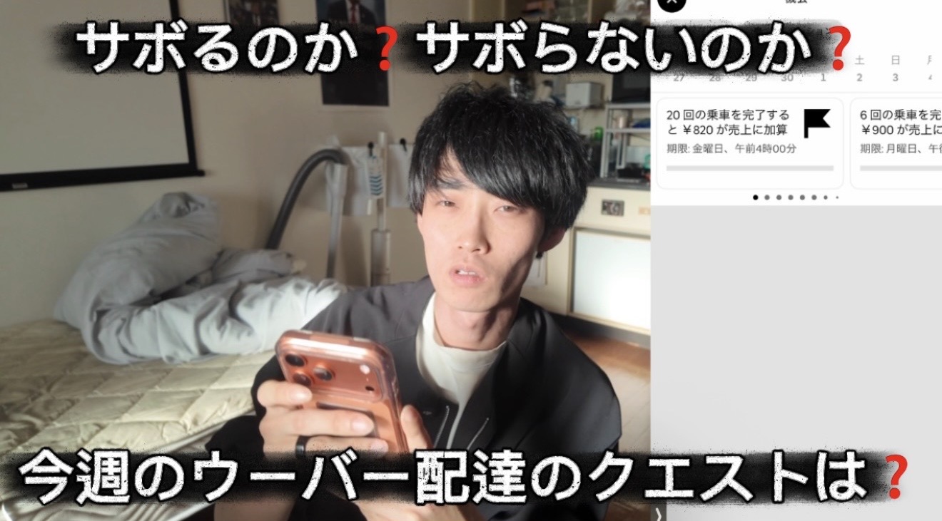 昼12時を迎え、「今から誰にも見られない悲しい動画を作っていきます」と自嘲しつつ動画録画に着手します。午後16時55分には「ニート日記を書いていきます」と記し、本日の出来事を淡々とまとめる姿勢が見られます。ここでUber配達の収入インセンティブを巡る報告が始まり、月曜~日曜までの日替わりボーナス条件(6回乗車で900円、3回で600円等)がどれも「しょぼい」と不満げに語られます。火曜・水曜の条件も同様に渋く、「今週はダメだ」「嬉しいところもあるけど、頑張っても稼げへんから気楽」と、社会的プレッシャーが薄い中での諦観や、そのぶん楽になれる心境など、淡々とした視点で手ごたえの薄い日常を描きます。土日も同じく期待薄で、「もう今日サボっちゃうか」と正直な思いを吐露しつつ、予定の立て直しや気分転換が試みられています。